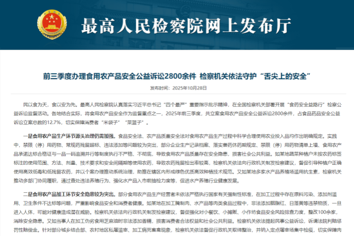 前三季度立案辦理食用農(nóng)產(chǎn)品安全公益訴訟2800余件?檢察機(jī)關(guān)依法守護(hù)“舌尖上的安全”